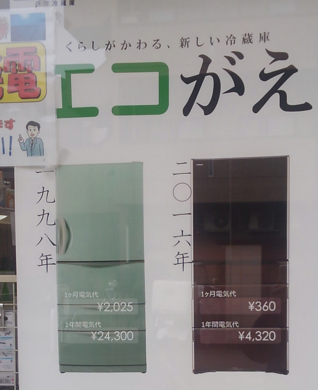 結局、このポスターのメーカーの製品にはしなかったのですが、買い替えて最初の電気代の請求を見たところ、10%近く消費電力が下がっていました。翌月も同じぐらい下がっていたので、これは、冷蔵庫買い替えの効果だと思われます。